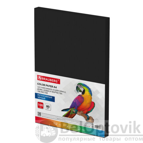 Упакована в пачку из 100 листов формата А4. В упаковке бумага интенсивного тона черного цвета. Листы бумаги плотностью 80 г/м2 подходят для офисной техники.