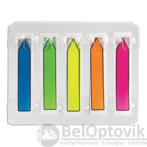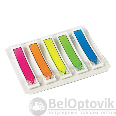 Набор пластиковых закладок 5 неоновых цветов размером 48х10 мм состоит из 100 листов, по 20 закладок каждого цвета. Клейкий слой - 22 Н/м. Легко клеятся к любой поверхности и не оставляют следов. Материал закладок позволяет делать надписи ручкой и карандашом. Уложены в диспенсере. Поставляются в полиэтиленовом пакете с европодвесом.