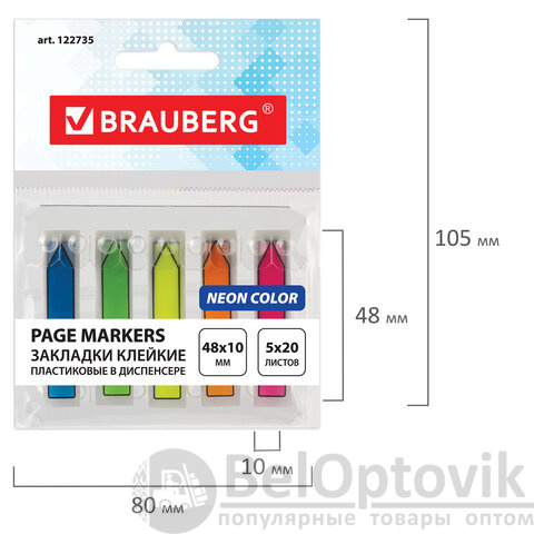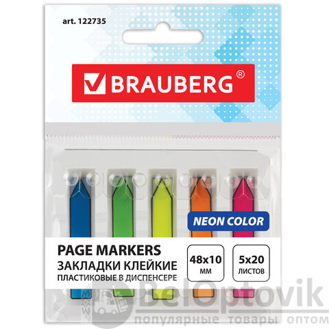 Закладки клейкие неоновые BRAUBERG, 48х10 мм, 100 штук (5 цветов х 20 листов), в пластиковом диспенсере, 122735