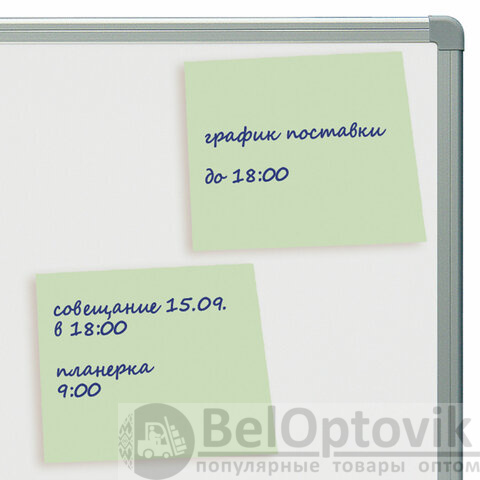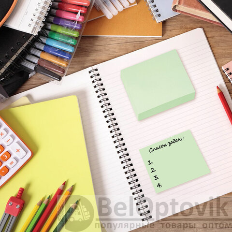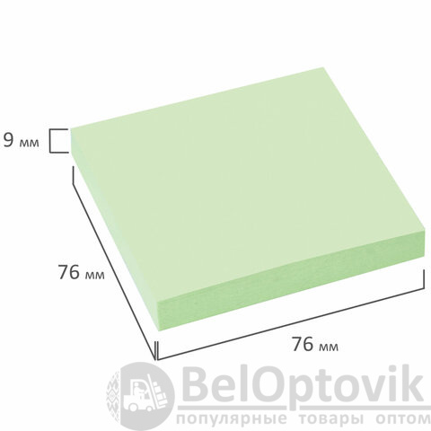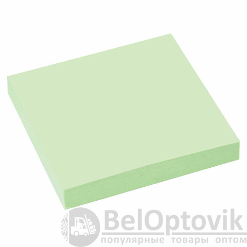 Стикеры зелёного пастельного цвета в форме квадрата 76х76 мм состоят из 100 листов. Плотность бумаги составляет 75 г/м2. Клейкий слой - 22 Н/м. Легко клеятся к любой поверхности. Не оставляют следов. Упакованы в полиэтиленовую пленку.