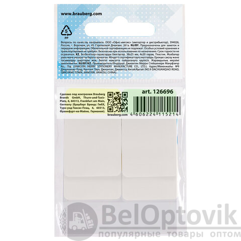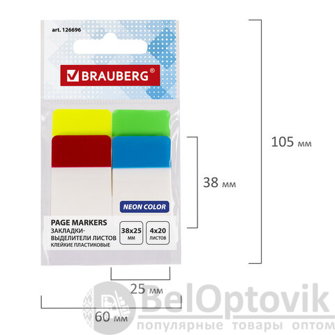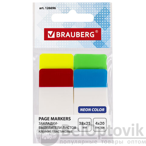 Закладки клейкие BRAUBERG, 38х25 мм, 80 штук (4 цвета х 20 листов), 126696