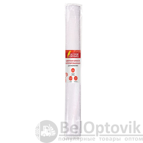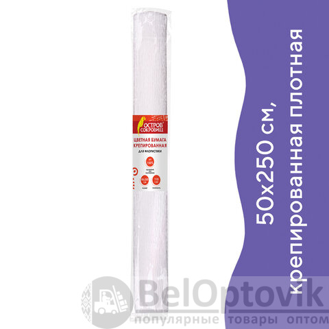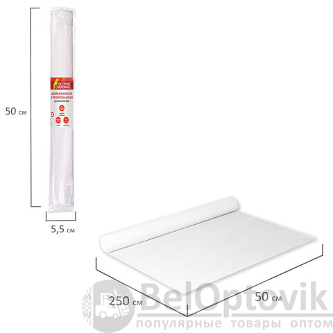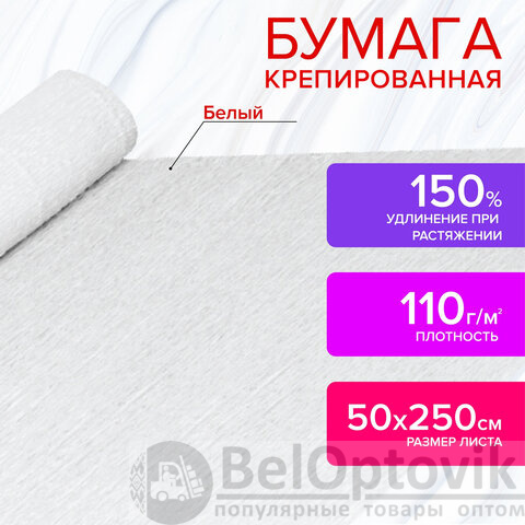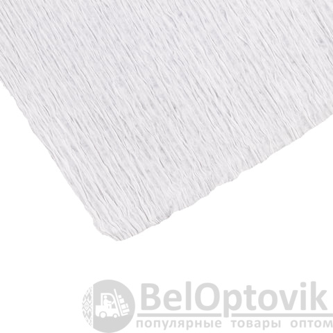 Крепированная бумага представляет собой бумажную продукцию с неровной, складчатой поверхностью. Размер бумаги 50х250 см, плотность – 110 г/м2, удлинение при натяжении – 150%. Цвет - Белый.