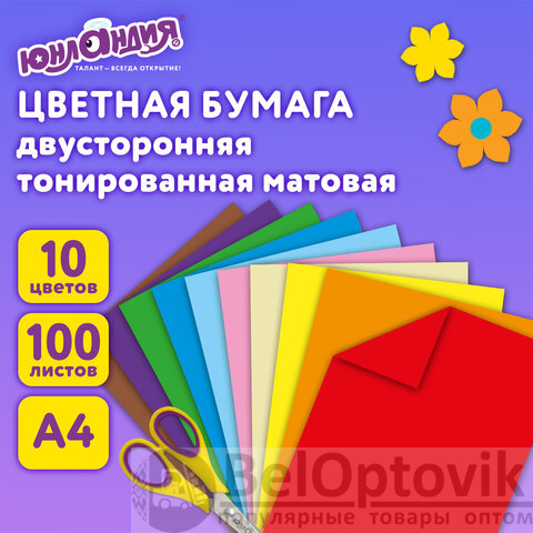 Цветная бумага А4, ТОНИРОВАННАЯ В МАССЕ, 100 листов, 10 цветов, склейка, 80 г/м2, ЮНЛАНДИЯ, 210х297 мм, 129891