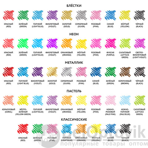Цвет пастельных чернил: коралловый, жёлто-зеленый, голубой, фиолетовый, оранжевый, жёлтый, розовый, нежно-розовый, нежно-голубой, салатовый.