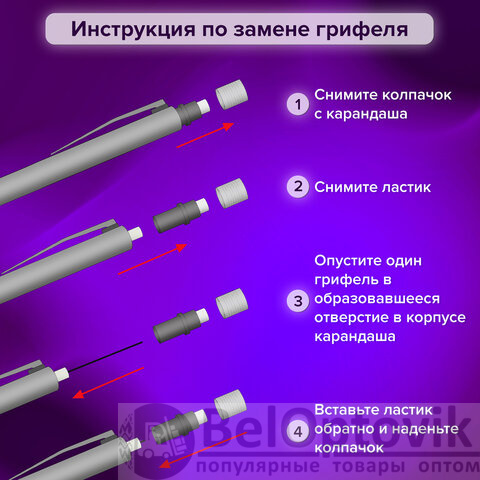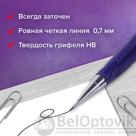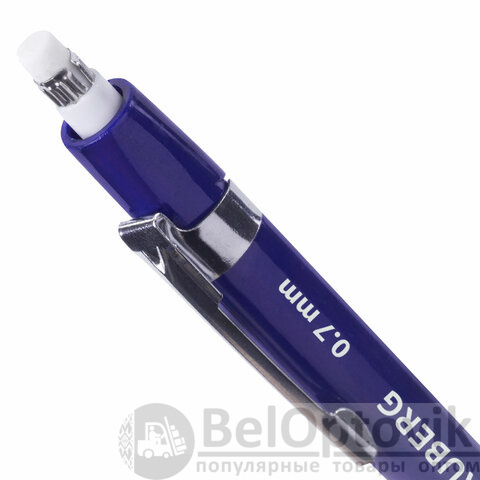 В наборе: механический карандаш c трехгранной эргономичной формой корпуса и антискользящим рифлением в зоне захвата. Имеет металлический клип и ластик. В НАБОР входят 12 запасных грифелей!