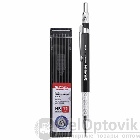 Карандаш механический цанговый 2 мм + грифели HB 12 штук на блистере, BRAUBERG "METALLIC-X 20", металлические детали, 181967