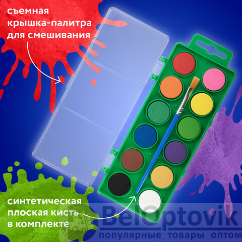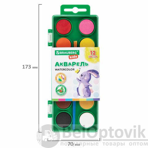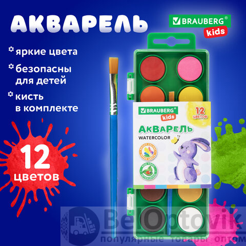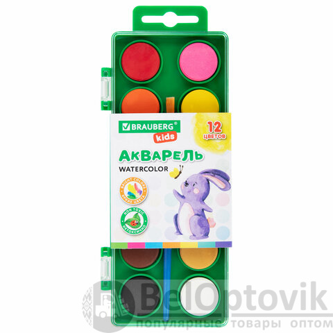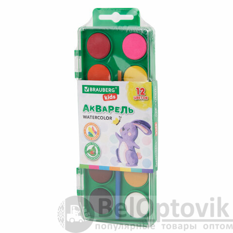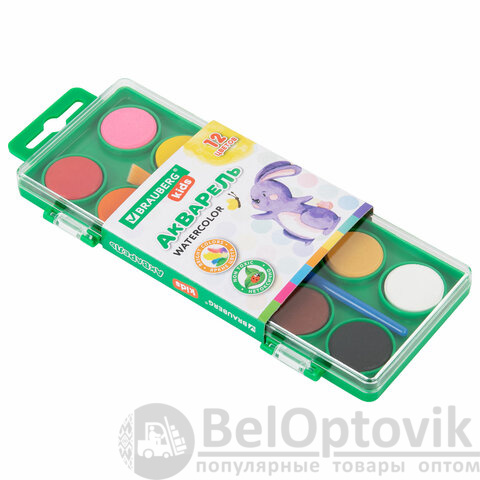 Краски акварельные BRAUBERG KIDS, 12 ярких цветов, круглые кюветы, пластиковый пенал, 191806