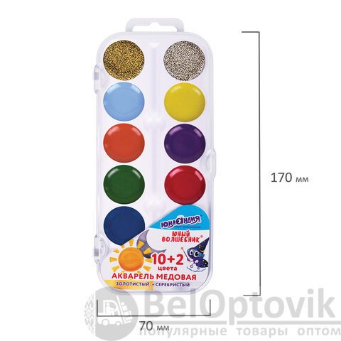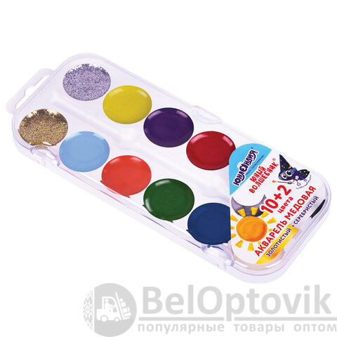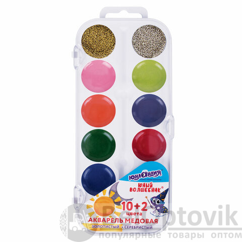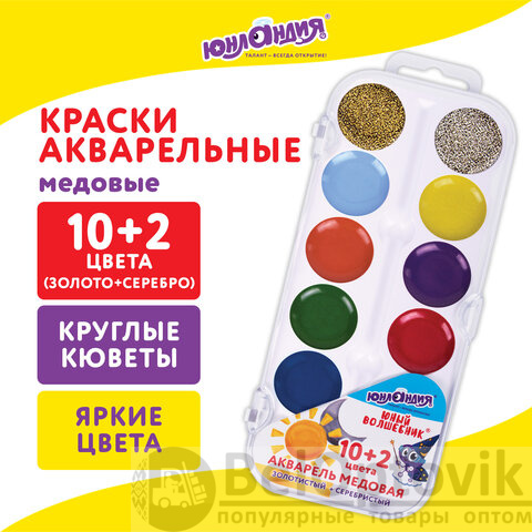 Краски акварельные ЮНЛАНДИЯ "ЮНЫЙ ВОЛШЕБНИК", медовые, 10+2 цвета (золото+серебро), круглые кюветы, пластик, 192360