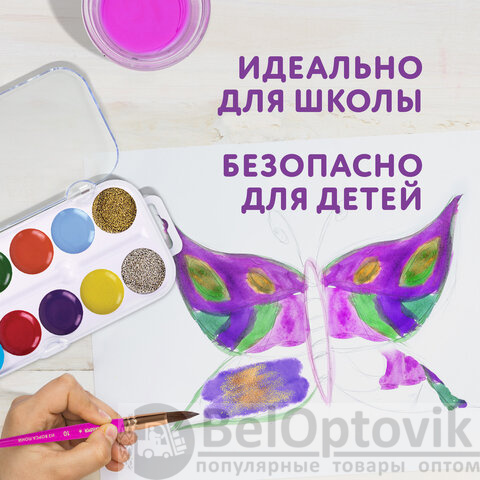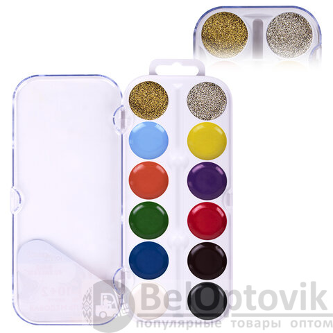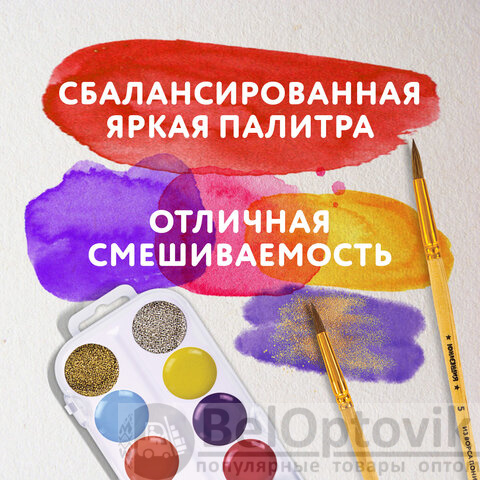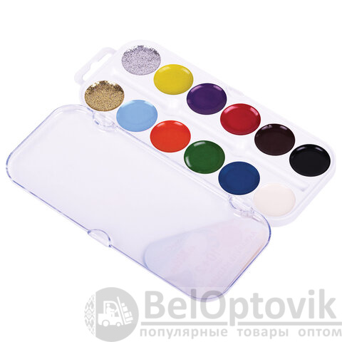 12 ярких насыщенных цветов, которые отлично смешиваются между собой и позволяют создать множество оттенков, обеспечивают однородное окрашивание. Включают два уникальных цвета с блестками – золотой и серебряный. Краски быстро высыхают и не портятся со временем. Безопасны для детей, нетоксичны. Выпускаются в пластиковом пенале с прозрачной крышкой, круглой формой кювет и отделением для кисточки. Упаковка обладает компактными размерами и легким весом.