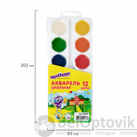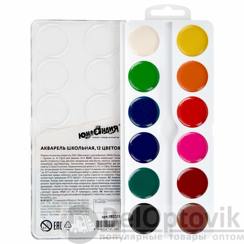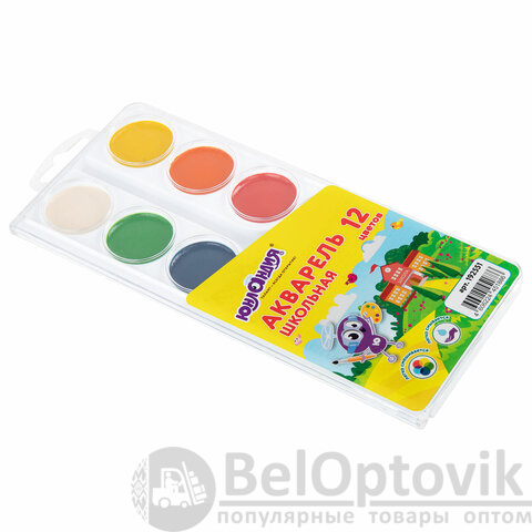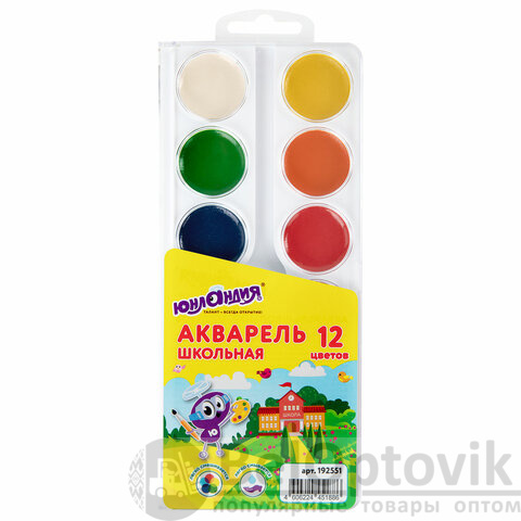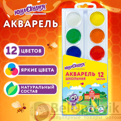 Краски акварельные ЮНЛАНДИЯ "ШКОЛЬНЫЕ" 12 цветов, медовые, круглые кюветы, 192551