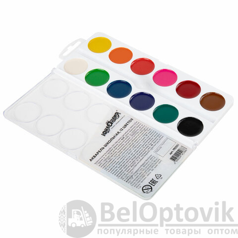 12 ярких насыщенных цветов отлично смешиваются между собой и позволяют создать множество оттенков, обеспечивают однородное окрашивание. Краски быстро высыхают и не портятся со временем. Безопасны для детей, нетоксичны. Выпускаются в пластиковом пенале с прозрачной крышкой, круглой формой кювет и отделением для кисточки. Упаковка обладает компактными размерами и легким весом.
