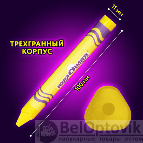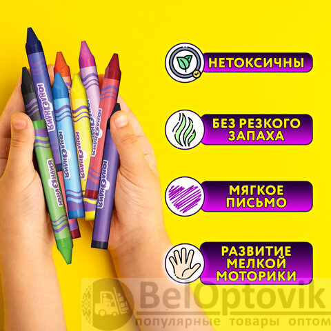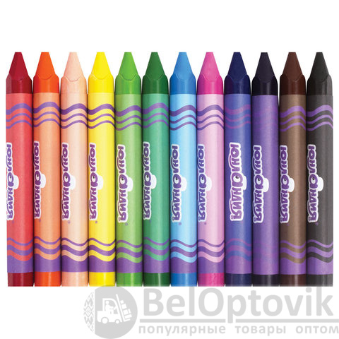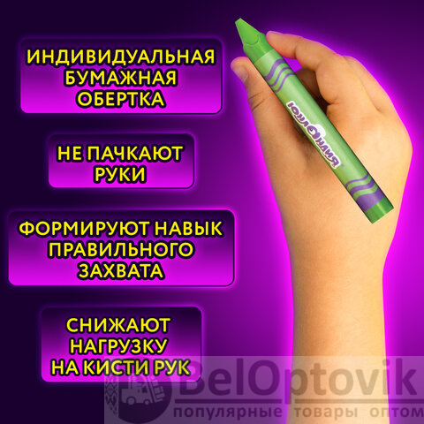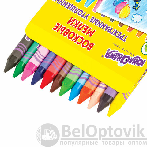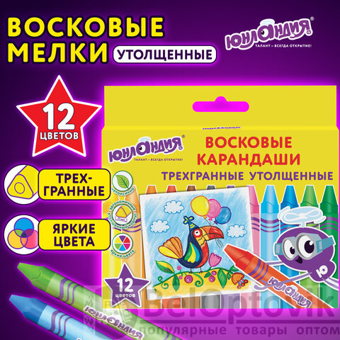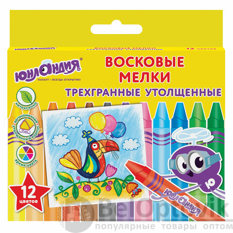 Палитра состоит из 12 ярких и насыщенных цветов. Полностью безопасны в использовании, не токсичны и не имеют резкого запаха. Благодаря своему составу мелки пишут мягко, и ребенку не придется прикладывать усилия в процессе рисования. Утолщенная трехгранная форма корпуса и диаметр 11 мм делают их еще более удобными для тренировки руки к письму у дошкольников и детей младшего школьного возраста, формируют навык правильного захвата, снижают нагрузку на кисти рук. Каждый мелок завернут в бумажную этикетку, что предохраняет от загрязнений, снижает скольжение, увеличивает прочность. Восковые мелки упакованы в картонную коробку с европодвесом.