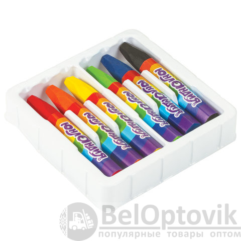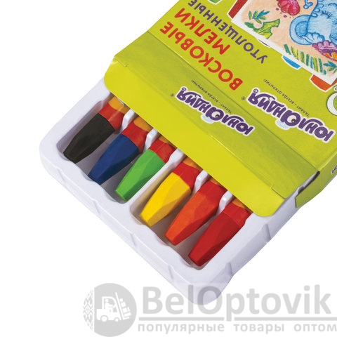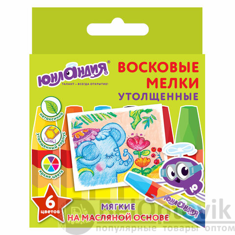 Палитра состоит из 6 ярких и насыщенных цветов. Полностью безопасны в использовании, не токсичны и не имеют резкого запаха. Благодаря своему составу карандаши пишут мягко – ребенку не придется прикладывать усилия в процессе рисования. Утолщенная шестигранная форма корпуса и диаметр 11 мм делают их еще более удобными для тренировки руки к письму у детей, формируют навык правильного захвата, снижают нагрузку на кисти рук, отлично развивают мелкую моторику. Каждый карандаш завернут в бумажную этикетку, что предохраняет от загрязнений, снижает скольжение, увеличивает прочность. Восковые карандаши упакованы в картонную коробку с европодвесом.