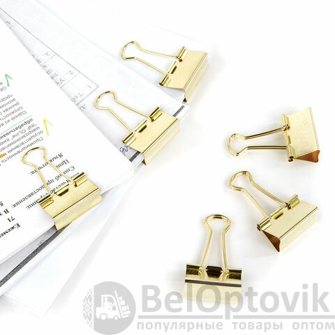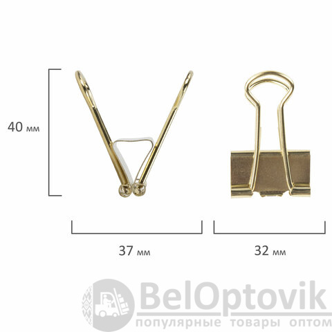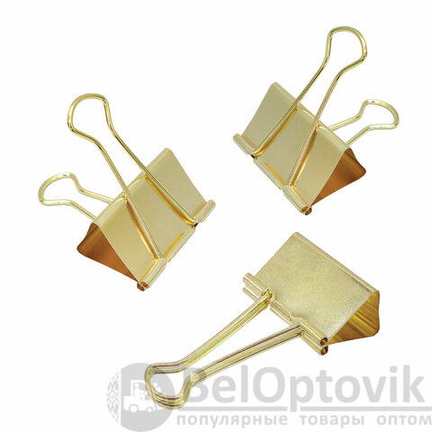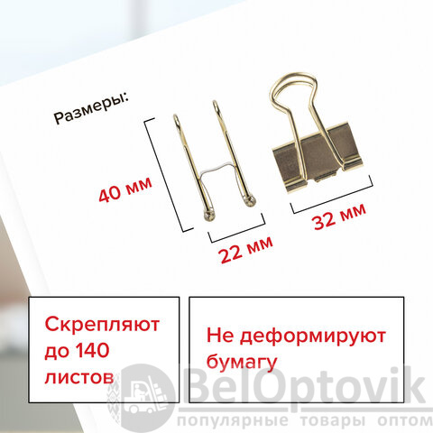 Изготовлены из стали с золотистым покрытием. Позволяют скреплять до 140 листов. Не деформируют бумагу. Ширина зажима - 32 мм. Поставляются по 12 штук в пластиковой коробке с подвесом.
