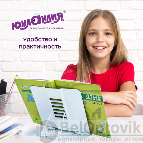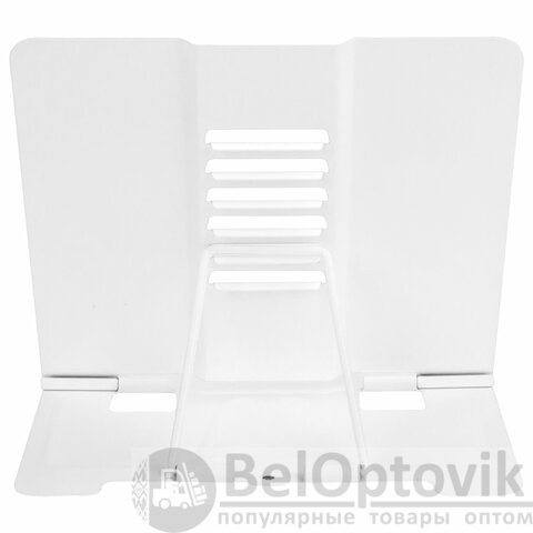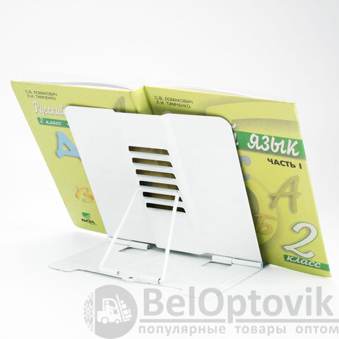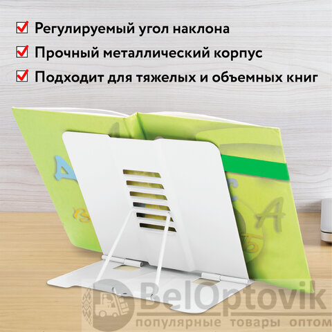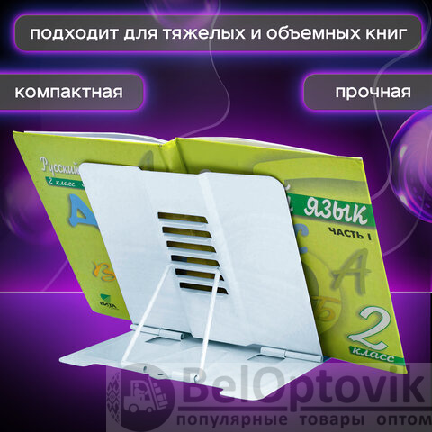 Подставка полностью изготовлена из металла, поэтому отлично подойдет для надежной фиксации тяжелых и объемных учебных материалов и книг. Оригинальный дизайн понравится как младшим школьникам, так и школьникам среднего звена. Регулируемый угол наклона обеспечивает удобство при работе с текстом, облегчает чтение и подготовку домашней работы. Размер подставки – 20х18,5 см. Цвет – белый.