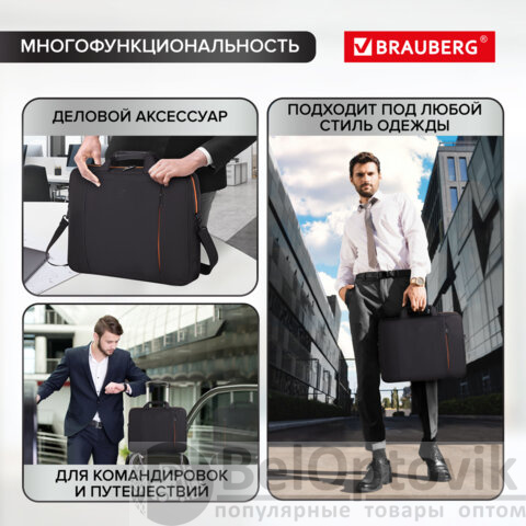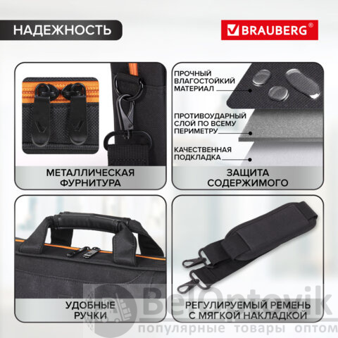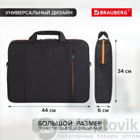 Сумка портфель BRAUBERG OFFICE с отделением для ноутбука 17,3", черная, 34х44х6 см, 270826