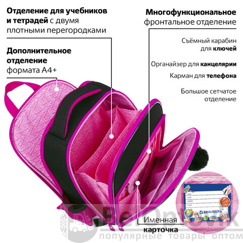 Яркая этикетка расположена на передней стороне ранца, делая его более заметным на полке магазина. Информация на ней отражает главные потребительские свойства, помогая покупателю принять решение о покупке.