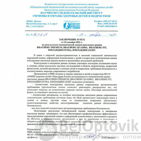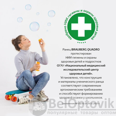 Ранцы BRAUBERG QUADRO протестированы НИИ гигиены и охраны здоровья детей и подростков ФГАУ "Национальный медицинский исследовательский центр здоровья детей". В рамках проведенных исследований* было установлено, что конструкции и материалы ученических ранцев соответствуют современным эргономическим требованиям и способствуют формированию здоровой осанки у школьников.