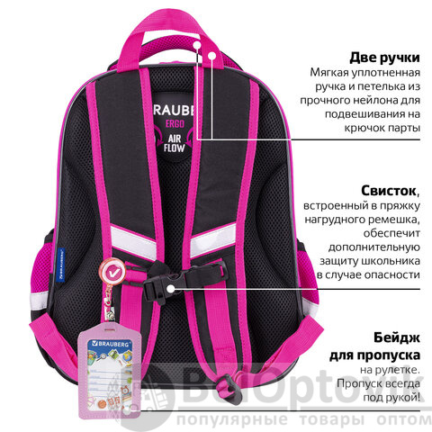Съемные нагрудные ремешки помогают равномерно распределять нагрузку на спину. Свисток, встроенный в пряжку нагрудного ремешка, обеспечит дополнительную защиту школьника в случае опасности.