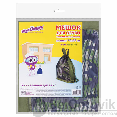Мешок для обуви упакован в плотный ПЭТ-пакет, который сохранит качество и товарный вид при хранении и транспортировке.