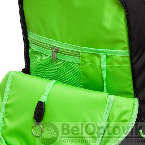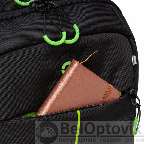 Есть два больших отделения: одно для книг, документов и пособий формата А4, другое для принадлежностей. Много карманов внутри и снаружи, карман для ноутбука 13", так же сетчатый карман с замком для смартфона или очков.
