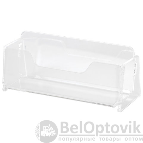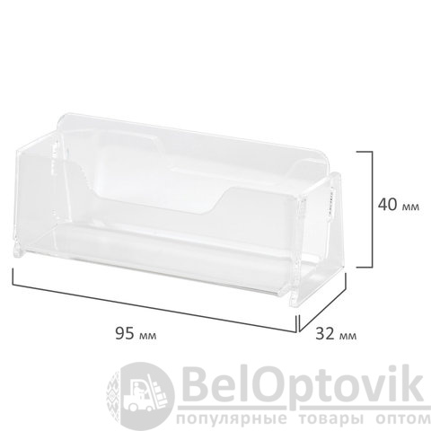 Изготовлена из прозрачного оргстекла. Имеет одно отделение, способное вместить 40 визиток шириной 95 мм. Размер - 40х95х32 мм. Поставляется в картонной коробке.