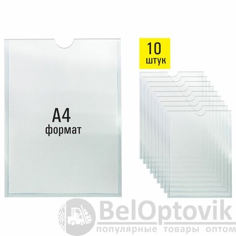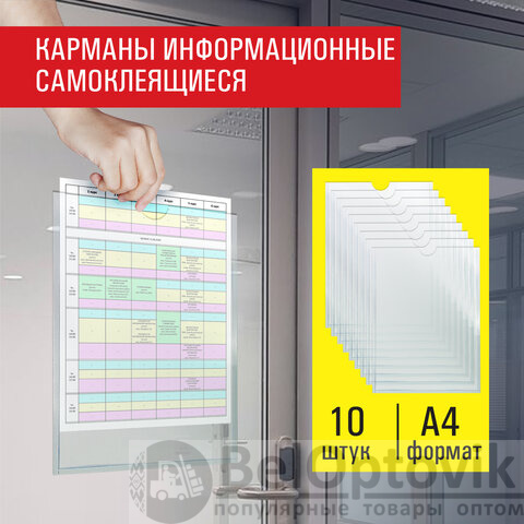 Карманы информационные самоклеящиеся, А4, вертикальные, КОМПЛЕКТ 10 шт., ПЭТ, 0,3 мм, STAFF, 291280