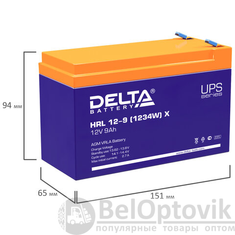 Аккумуляторная батарея для ИБП любых торговых марок, 12 В, 9 Ач, 151х65х94 мм, DELTA, HRL 12-9 (12-34W) X, HRL12-9(1234W)X