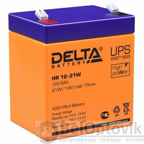 Батарея аккумуляторная Delta HR 12-21 W используется в медицинском оборудовании, источниках бесперебойного питания и резервного энергоснабжения, различных областях приборостроения. Батарея изготовлена по технологии AGM. Легированные кальцием свинцовые пластины обеспечивают низкий саморазряд, высокую прочность решетки. Корпус аккумулятора выполнен из пластика ABS, который не горит. Батарея необслуживаемая, не требует долива воды. Обладает высокой энергоотдачей благодаря использованию более массивных пластин.