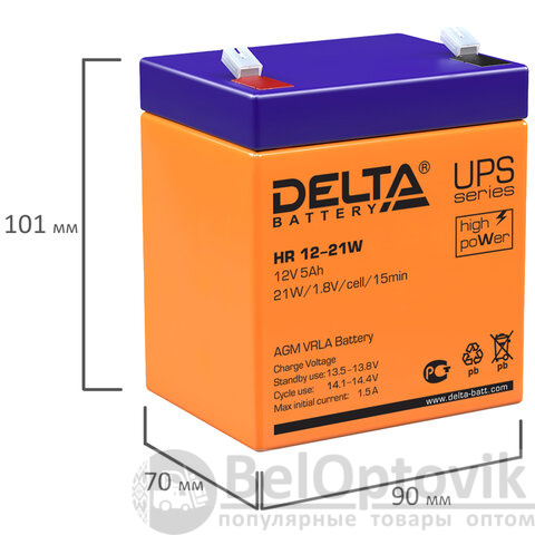 Аккумуляторная батарея для ИБП любых торговых марок, 12 В, 5 Ач, 90х70х101 мм, DELTA, HR 12-21 W