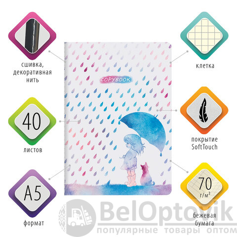 Общая тетрадь формата А5 содержит 40 листов с линовкой в клетку. Сшивка плотно соединяет листы. Обложка изготовлена из высококачественного импортного картона с двусторонней запечаткой, что придает тетради изысканный и неповторимый стиль. Специальное покрытие "SoftTouch" с повышенными тактильными свойствами придает обложке мягкий, бархатистый эффект. Внутренний блок - тонированная офсетная бумага цвета слоновой кости плотностью 70 г/м2.