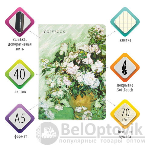 Общая тетрадь формата А5 содержит 40 листов с линовкой в клетку. Сшивка плотно соединяет листы. Обложка изготовлена из высококачественного импортного картона с двусторонней запечаткой, что придает тетради изысканный и неповторимый стиль. Специальное покрытие "SoftTouch" с повышенными тактильными свойствами придает обложке мягкий, бархатистый эффект. Внутренний блок - тонированная офсетная бумага цвета слоновой кости плотностью 70 г/м2.