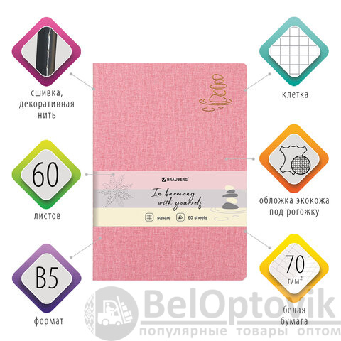 Тетрадь 60 л. в клетку обложка кожзам под рогожку, сшивка, B5 (179х250мм), РОЗОВЫЙ, BRAUBERG HARMONY, 403840