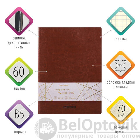 Общая тетрадь формата В5 содержит 60 листов с линовкой в клетку. Сшивка плотно соединяет листы. Обложка изготовлена из высококачественной экокожи, стилизованной под классическую кожу, что придает тетради изысканный и неповторимый стиль. Внутренний блок - бежевая офсетная бумага плотностью 70 г/м2.