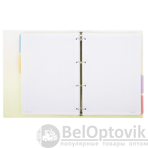 Тетрадь состоит из 120 листов офсетной бумаги плотностью 70 г/м2 с линовкой в клетку. Увеличенный формат А4 предназначен для ведения большого объема записей. Кольцевой механизм позволяет легко сменить внутренний блок на новый, не покупая при этом новую тетрадь. Диаметр колец составляет 25 мм. Одна такая тетрадь способна заменить несколько небольших тетрадей для разного рода информации. Для удобства ведения записей тетрадь снабжена разделителями.