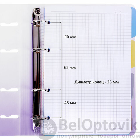 Тетрадь состоит из 120 листов офсетной бумаги плотностью 70 г/м2 с линовкой в клетку. Формат А5 является стандартным и обеспечивает комфортное ношение в рюкзаке/ранце или сумке. Кольцевой механизм позволяет легко сменить внутренний блок на новый, не покупая при этом новую тетрадь. Диаметр колец составляет 25 мм. Одна такая тетрадь способна заменить несколько небольших тетрадей для разного рода информации. Для удобства ведения записей тетрадь снабжена разделителями.