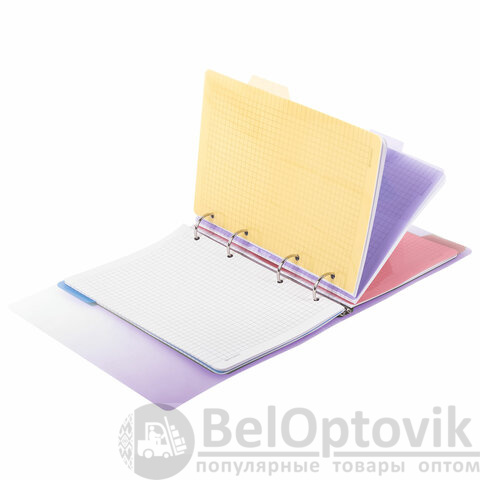 Жесткая пластиковая обложка надежно защищает внутренний блок тетради. Благодаря твердости пластика записи можно производить на весу. Импортный кольцевой механизм позволяет легко сменить внутренний блок.