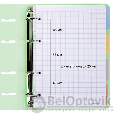 Кольцевой механизм позволяет легко сменить внутренний блок на новый, не покупая при этом новую тетрадь. Диаметр колец составляет 25 мм. Одна такая тетрадь способна заменить несколько небольших тетрадей для разного рода информации. Для удобства ведения записей тетрадь снабжена разделителями.