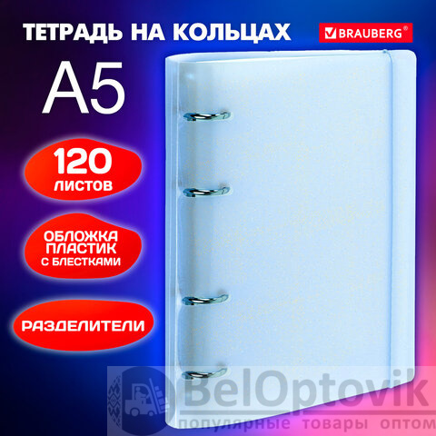 Тетрадь на кольцах А5 175х220 мм, 120 л., пластик, с резинкой и разделителями, BRAUBERG, Голубой, 404633