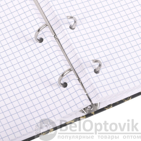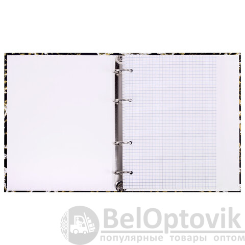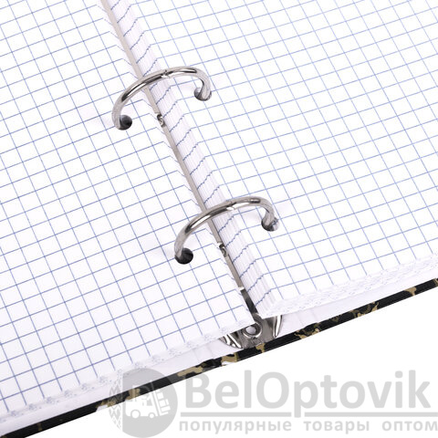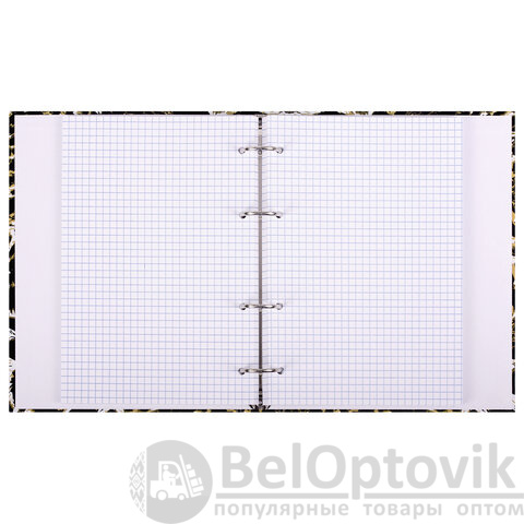 Снабжена кольцевым механизмом с 4 кольцами для подшивки сменных блоков, что позволит брать на учебу/работу всего одну тетрадь с возможностью добавлять и менять листы.
