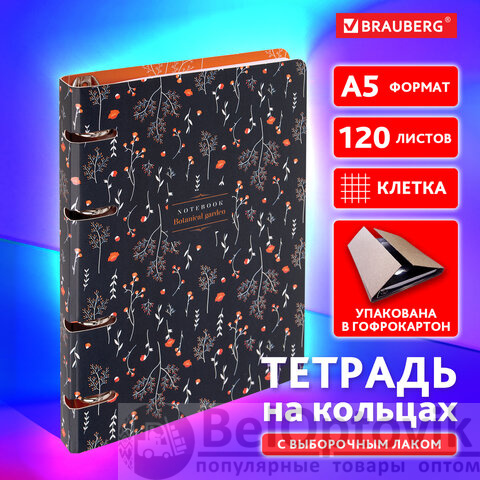 Тетрадь на кольцах А5 160х212 мм, 120 листов, картон, выборочный лак, клетка, BRAUBERG, "Flowers", 404729