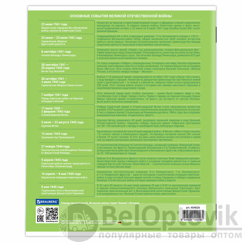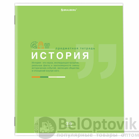 Тетрадь по истории формата А5 (165х202 мм) содержит 36 листов, изготовленных из высококачественной офсетной бумаги плотностью 60 г/м2, 100% белизны. Листы соединены скобами. Линовка блока - клетка, красные поля. Обложка выполнена из мелованной бумаги плотностью 170 г/м2. На обратной стороне обложки расположены основные подсказки по школьному предмету.