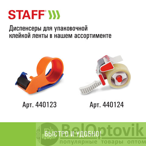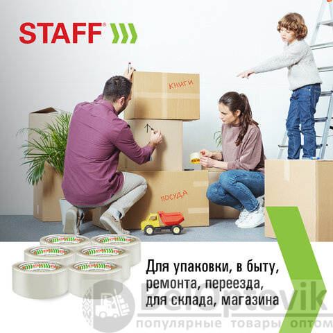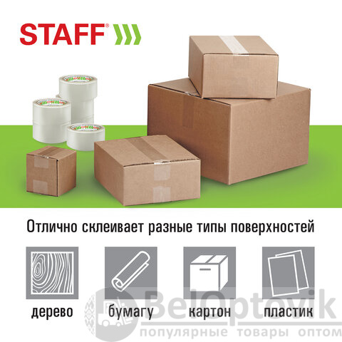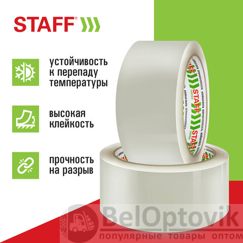 Упаковочная клейкая лента STAFF активно используется в торговле, промышленности, быту и подходит для оперативной упаковки с помощью диспенсера или вручную. Отличается высокой адгезией клея (слипанием с поверхностью) и стойкостью к разрыву.