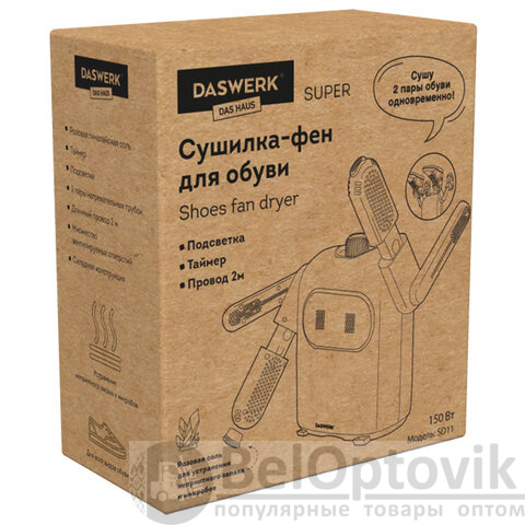 Сушилка-фен DASWERK создана для бережного и безопасного ухода за обувью, перчатками и варежками. Особая технология нагрева уничтожает неприятный запах и дезинфицирует обувь.
