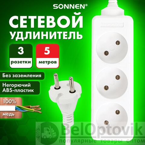 Удлинитель сетевой SONNEN U-135, 3 розетки, без заземления, 6 А, 5 м, белый, 511430
