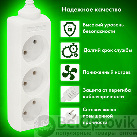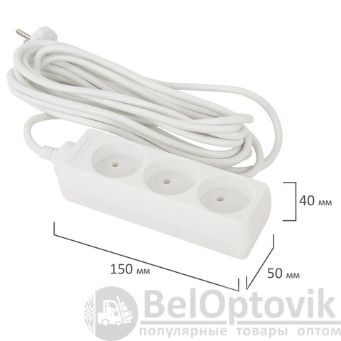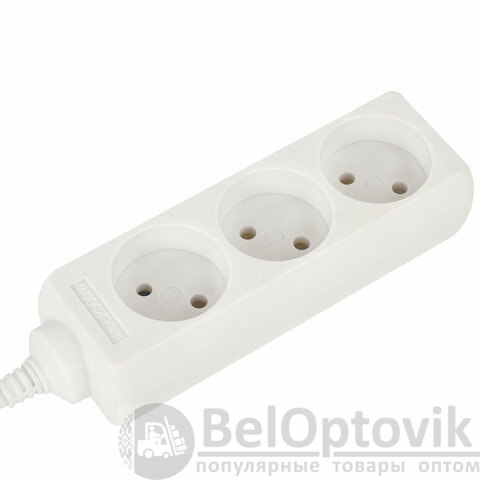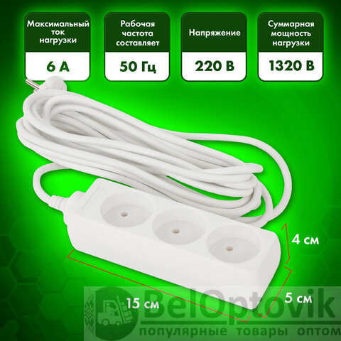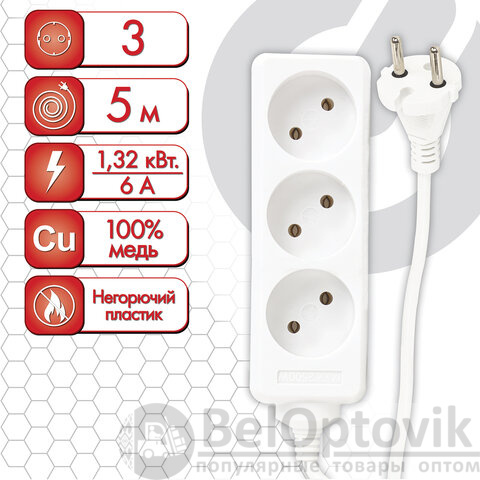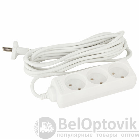 Сетевой удлинитель в пластиковом корпусе оснащен 3 евророзетками без заземления. Максимальный ток нагрузки подключенных устройств может достигать 6 А. В сочетании эти параметры позволяют безопасно подключать к удлинителю до 3 электроприборов. Длина кабеля – 5 метров, что позволит использовать удлинитель как внутри помещения, так и снаружи.
