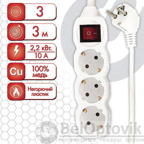 Сетевой удлинитель оснащен 3 евророзетками. Максимальный ток нагрузки подключенных устройств может достигать 10 А. В сочетании, эти параметры позволяют безопасно подключать к удлинителю до 3 электроприборов. Длина кабеля – 3 метра, что позволит использовать удлинитель как внутри помещения, так и снаружи.