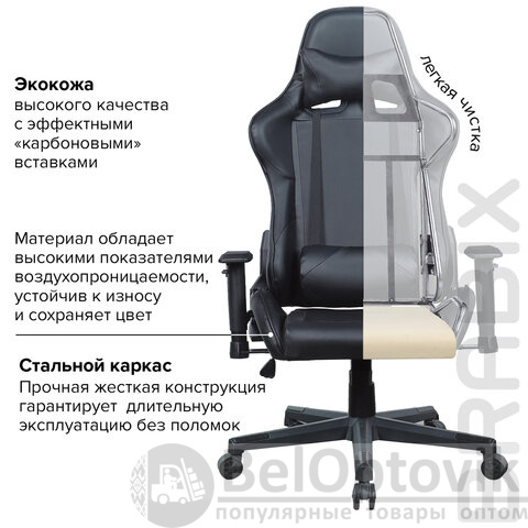 В обивке использована экокожа высокого качества c эффектными "карбоновыми" вставками. Материал обладает высокими показателями воздухопроницаемости, устойчив к износу, долго сохраняет цвет, приятен на ощупь и легко чистится.