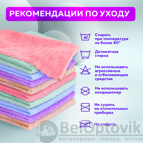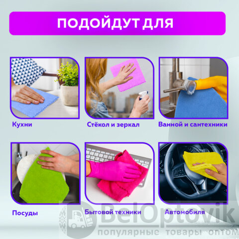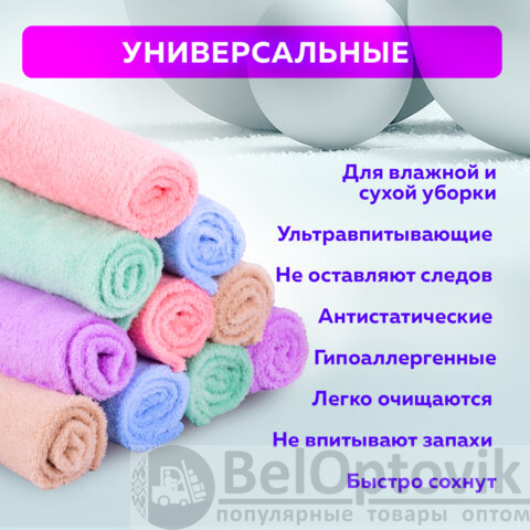 Отлично впитывает влагу, масло, грязь. Не оставляет разводов и ворса. Не царапает деликатные поверхности, такие как экраны и ЖК-мониторы, стекло, полированную мебель. Плотность 250 г/м2 обеспечивает высокую износостойкость и экономичный расход. Размер - 30х30 см. Сохраняет свои свойства даже при многократном применении. В комплект входит 20 салфеток. Цвета в комплекте: синий, фиолетовый, розовый, зеленый, коричневый.