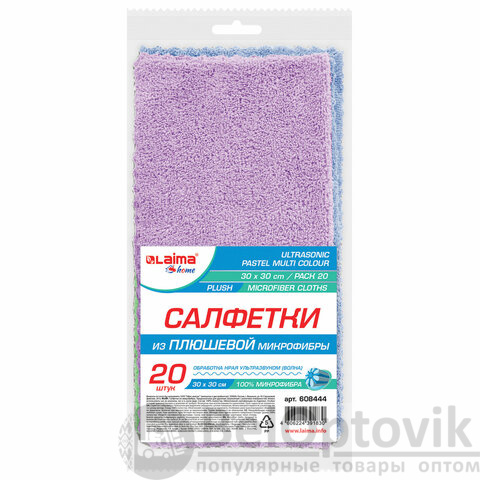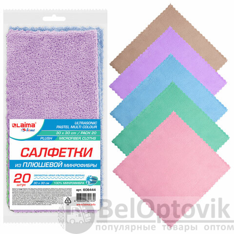Салфетки из МИКРОФИБРЫ ПЛЮШЕВОЙ 30х30 см, КОМПЛЕКТ 20 шт., PASTEL, ассорти, 250 г/м2, LAIMA HOME, 608444